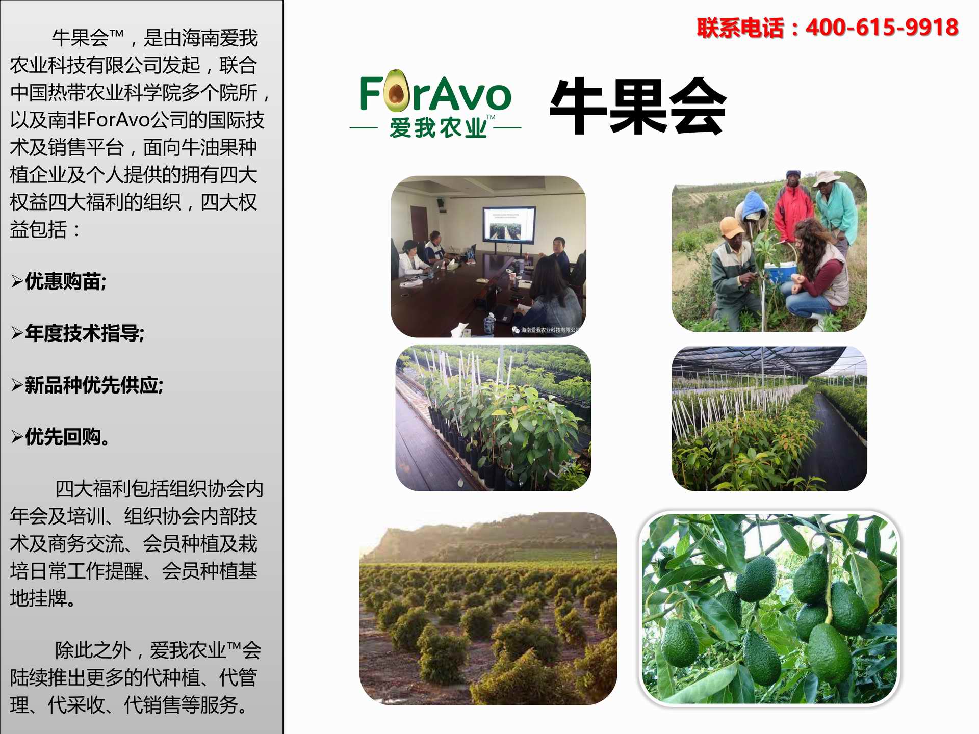海南愛我農(nóng)業(yè)科技有限公司是一家綜合性的高科技農(nóng)業(yè)發(fā)展企業(yè),旗下愛我農(nóng)業(yè)TM致力于打造中國最大最強(qiáng)的牛油果種植企業(yè)。依托美國、南非、澳大利亞等擁有百年牛油果繁育、種植歷史以及產(chǎn)業(yè)鏈?zhǔn)袌龅膬?yōu)勢,開展牛油果種苗繁育、種植技術(shù),種植加盟、深加工等產(chǎn)業(yè)。結(jié)合中國市場,面向廣大苗圃基地、種植農(nóng)場、合作加工等企業(yè),推出的適合規(guī)模化、標(biāo)準(zhǔn)化的牛油果全產(chǎn)業(yè)鏈服務(wù)。 Hainan Foravo Agricultural Technology Co., Ltd. is a comprehensive high-tech agricultural development enterprise , dedicated to building the largest and most powerful avocado plantation enterprise in China. Relying on the advantage of avocado nursery, planting history, and the industrial chain over 100 years in the United States, South Africa, Australia, we are carrying out nursery, planting, proce...